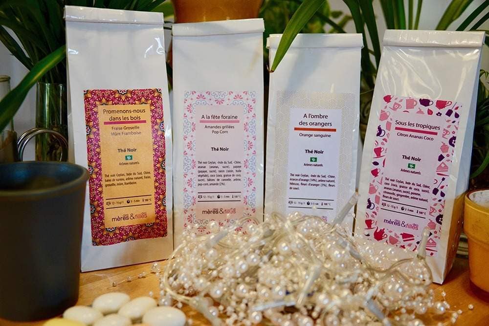 Thé Noir « À l’Ombre des Orangers » : Orange Hibiscus Thé Noir Promenons-nous dans les Bois : Fraise Groseille Mûre Framboise Thé Noir À la Fête Foraine : Amandes Grillées Pop-Corn Thé Noir Sous les Tropiques : Citron Ananas Coco Expédiés en conditionnement de quatre sachets de 50 g ou quatre sachets de 100 g. Prix affiché pour 4 sachets de 50 g : 21,00 € 4 sachets de 100 g : 44,00 €