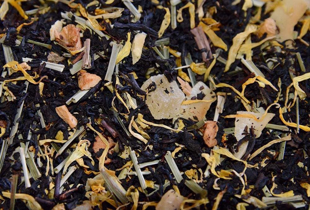 Composition Thé Noir Premium « Sous les Tropiques » : Thé noir Ceylan, thé noir d’Inde du Sud, yhé noir de Chine, coco (coco, graisse de coco, sucre), ananas (ananas, sucre), pomme, citronnelle, gingembre, arôme naturel, fleurs de souci. Conseils d’utilisation : 12 – 15 g/l. Infusion : 2 à 3 minutes. Température : 100 °C.