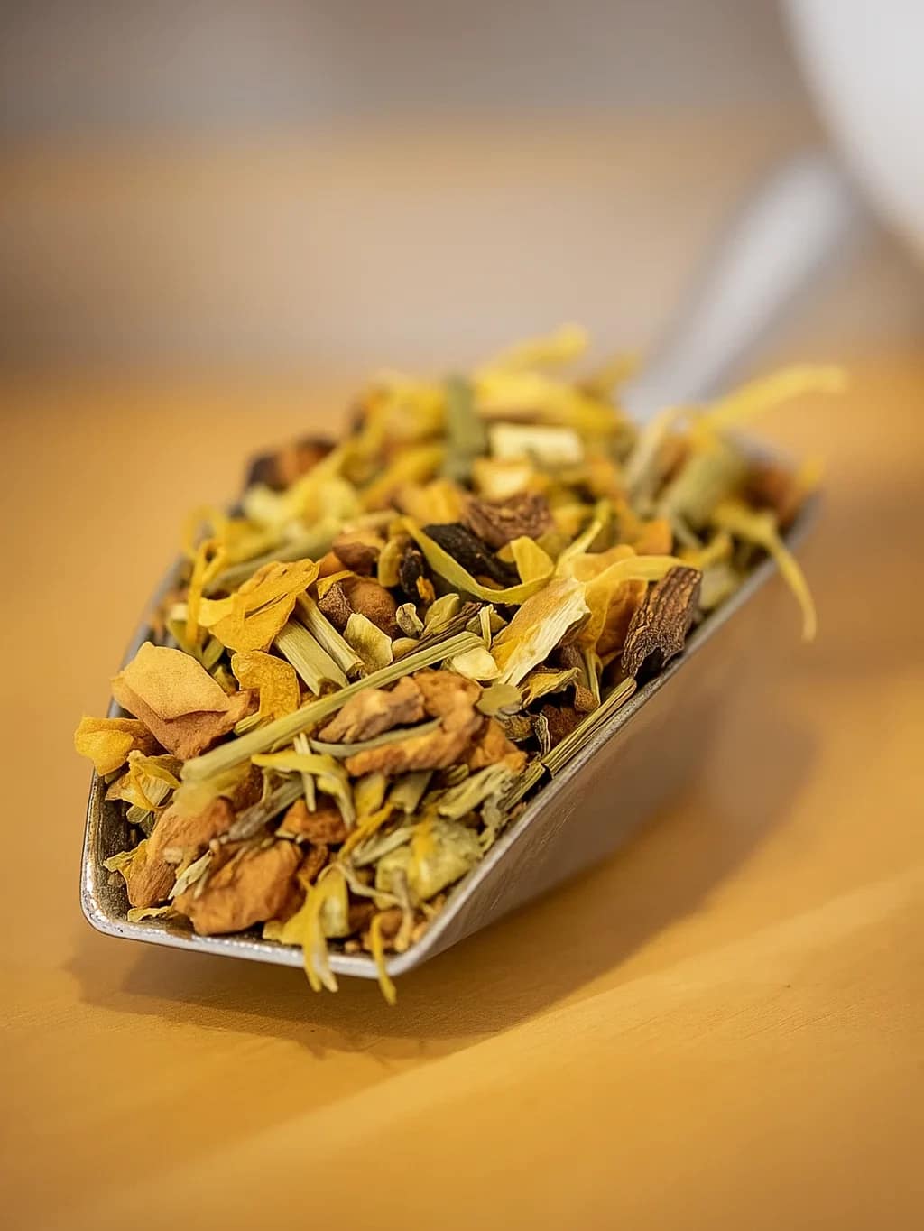 Composition Tisane Fruitée Premium « Soirée Flamboyante » Papaye Pamplemousse Orange : Pomme*, raisin (raisin, huile végétale)*, papaye*, écorces d’orange*, carotte*, citronnelle*, arôme naturel, fleurs de souci*. *Issu de l‘agriculture durable.